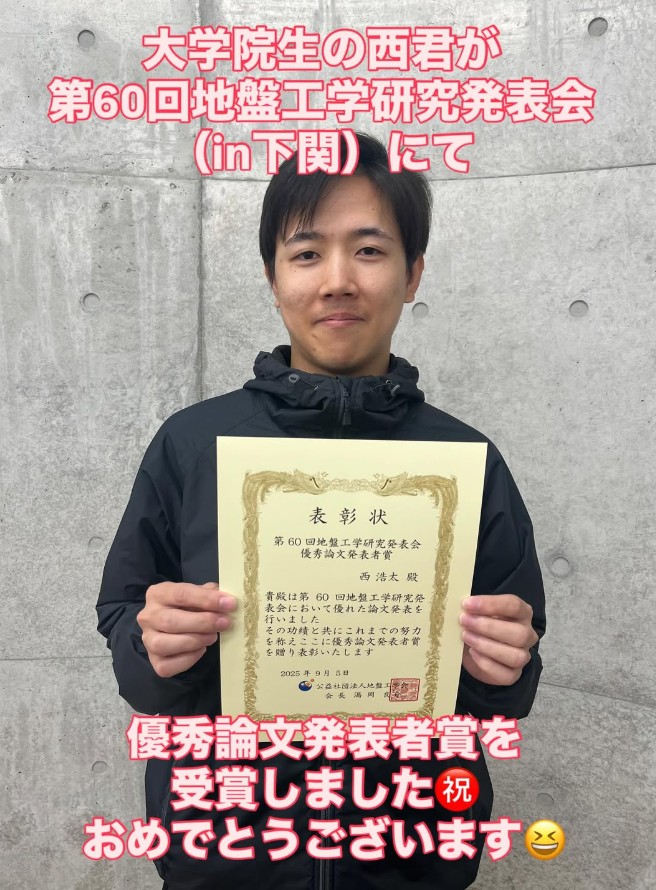 第60回地盤工学研究発表会において、大学院生の西浩太君が優秀論文発表者賞を受賞しました